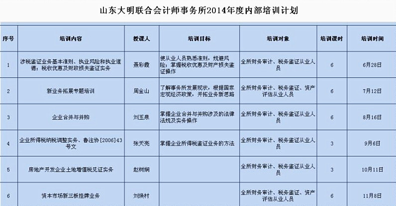 根据山东省注册会计师协会[2014]16号文件《关于下达<山东省2014年度注册会计师继续教育培训计划>的通知》要求, 我所特制订2014年度内部培训计划。现将培训计划(详见附件)下发给你们,望所有注册会计师及业务助理人员认真阅读计划内容,按照具体通知时间及时参加培训,培训期间我们将严格按照规章制度进行考勤,望高度重视。同时请各位授课人员充分做好课前的准备工作,以实现培训目的。