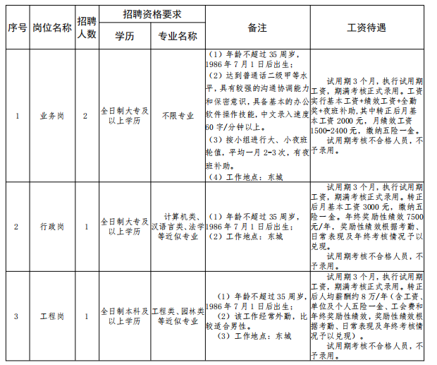 根据体检、考察结果确定拟录用人员,与东营蔚蓝人力资源有限公司签订劳动合同,派驻到东城机关或事业单位工作,试用期3个月,按规定缴纳五险一金。试用期考核不合格人员,不予转为正式录用人员。